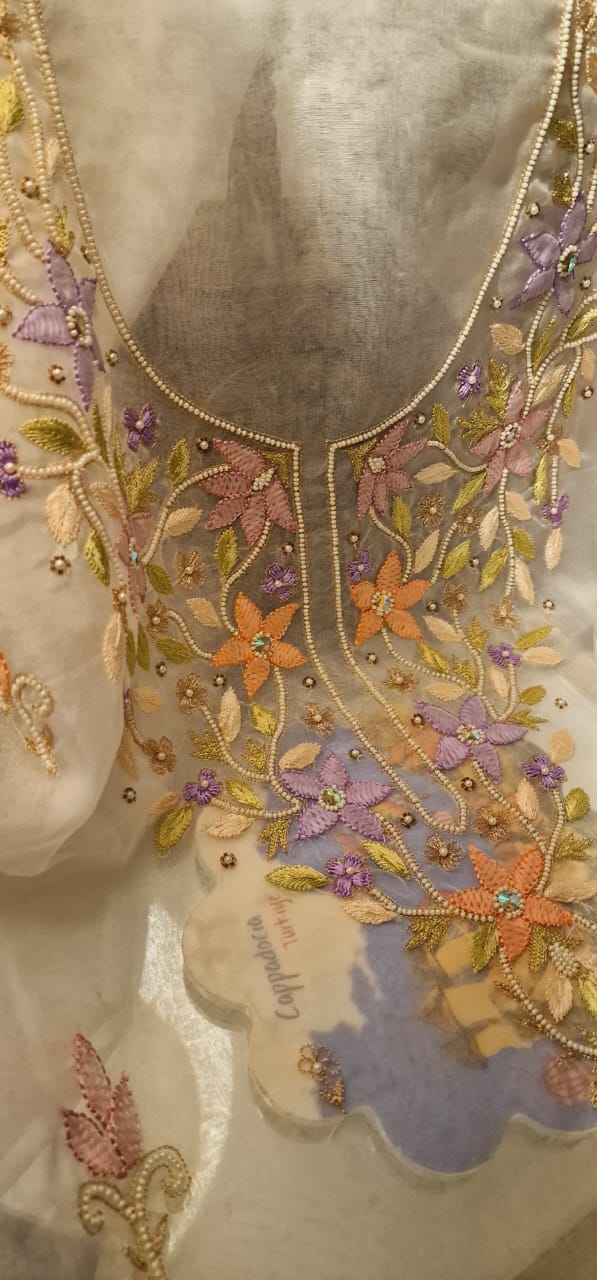 Hand work on neckline and small bunches all over front